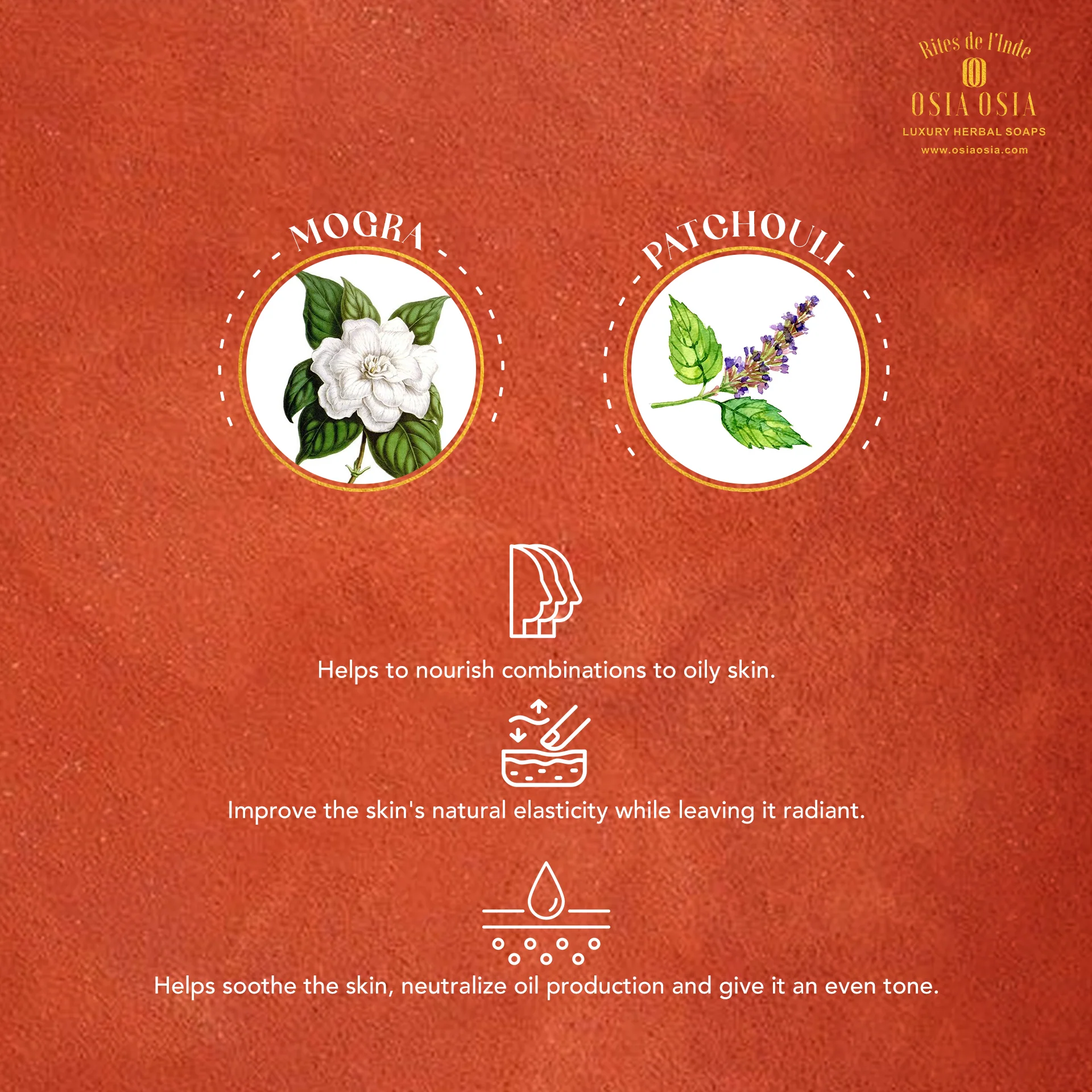 It is a unique Ayurvedic formula that blends the pure essential oils of Mogra and Patchouli to nourish combination to oily skin. It is blended with Vitamin C and antioxidant rich herb infusions, which help repair damaged skin cells, improve the skin's natural elasticity while leaving it radiant. It helps soothe the skin, neutralize oil production and give it an even tone. Patchouli Oil has a characteristic musky-sweet and earthy smell, which helps induce deep relaxation and meditativeness.